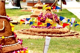 3. บุญสงกรานต์ บุญสงกรานต์ ถือเป็นประเพณีการส่งท้ายปีเก่าต้อนรับปีใหม่ไทย โดยถือเอาวันขึ้น 15 ค่ำเดือน 5 เป็นวันเริ่มต้นทำบุญ โดยมักจะมีการสรงน้ำพระพุทธรูป พระสงฆ์ ตลอดถึง ผู้เฒ่าผู้แก่ ซึ่งเป็นปู่ ย่า ตา ยาย ครูบาอาจารย์ หรือผู้หลักผู้ใหญ่ที่ควรแก่การเคารพสักการะ หลังจากนั้นก็จะเล่นสาดน้ำกันเป็นที่สนุกสนาน ขณะที่ตอนเย็นจะมีการก่อเจดีย์ทราย โดยชาวบ้านจะนำทรายจากที่ใดที่หนึ่งนำมาก่อเจดีย์ทรายที่ลานวัด วัตถุประสงค์ของการก่อเจดีย์ทรายนั้นแฝงไปด้วยกุศโลบาย โดยมีการผูกโยงประเพณีเข้ากับคติความเชื่อเรื่องเวรกรรมใน นอกจากคติความเชื่อเกี่ยวกับเจดีย์ทรายแล้วยังพบว่า ธุงได้เข้าไปมีบทบาทในบุญสงกรานต์ กล่าวคือ มีการปักธุงไชย และธุงช่อลงบนเจดีย์ทราย เพื่อถวายเป็นพุทธบูชาให้เป็นกุศลอานิสงส์